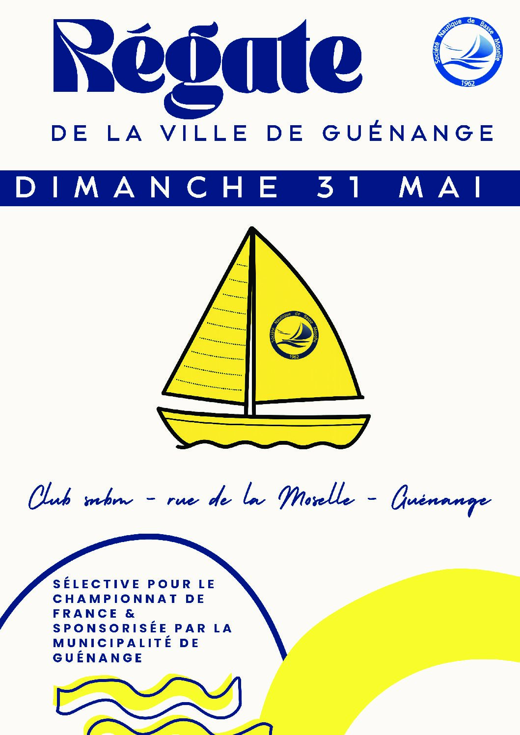 Régate Coupe de la ville de Guénange Régate départementale Coupe de la ville de Guénange Le dimanche 31 mai Infos : 06 85 94 08 92 contact@snbm.fr Localisation